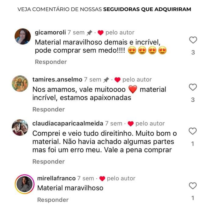 Logo após a confirmação do pagamento, o material será enviado diretamente no seu WhatsApp e e-mail, de forma imediata e vitalícia. É só baixar e começar a usar!